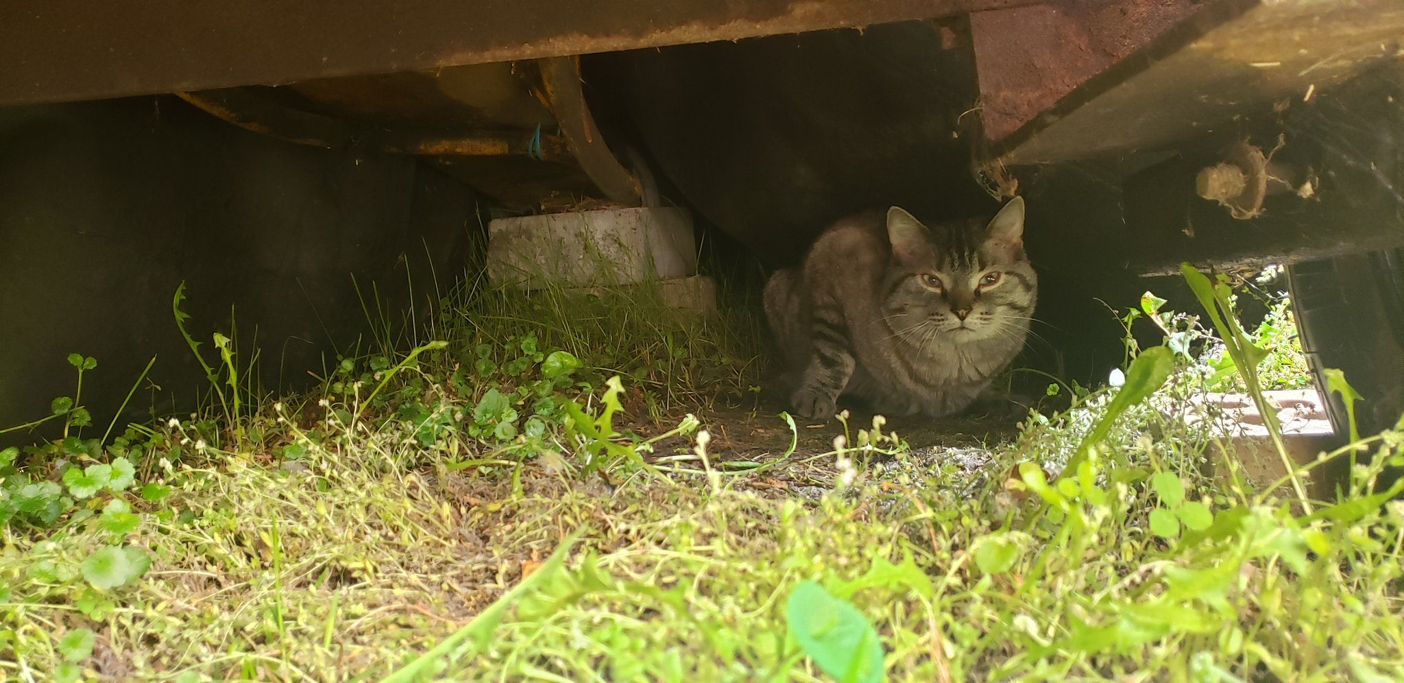 It was Choomba and he looked surprised to see me! The sonovabitch has been out having the time of his life! He ate the treats and I forgave him for running away but he didn't want to come inside. He was a little scared so I gave him some more food and some water and went to bed with the door open in case he wanted to come back inside. He did not, I woke up again this morning without my morning ritual so the first thing I did was go back to where I left his water and food and I found him sleeping nearby under the log splitter with a feather hanging off his whiskers. There was some of a dead bird near his food and I assume the rest of it was in his belly. He's probably been eating birds all week and that might be the reason he went out in the first place. Birds, after all, are really stupid and they taste great.